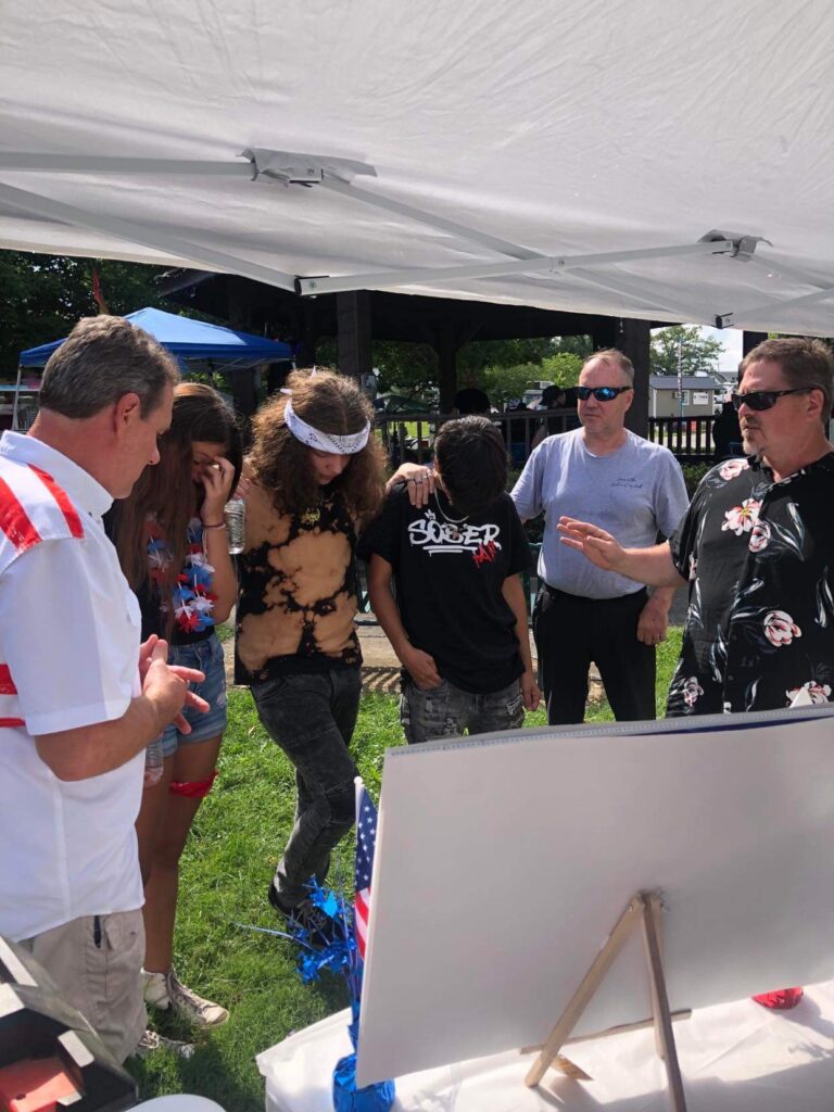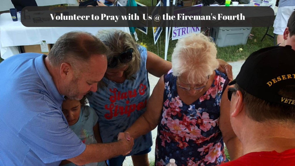 Charly Clark & Steve Hicks praying at the ACLG Prayer Booth at the Huntsville Fireman’s Fourth Festival 07.04.2025