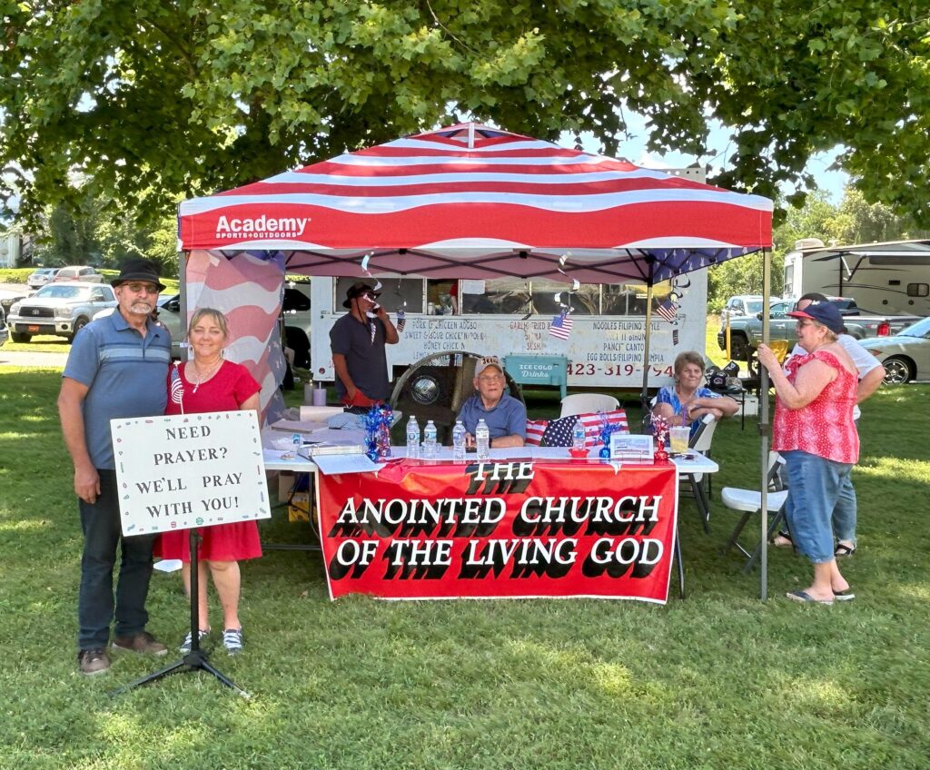 (l to r) Angel & Steve Hicks, Charly & Kathy Clark, Scarlett Clark, Eva & Alan Turner at the ACLG Prayer Booth at the Huntsville Fireman’s Fourth Festival 07.04.2025